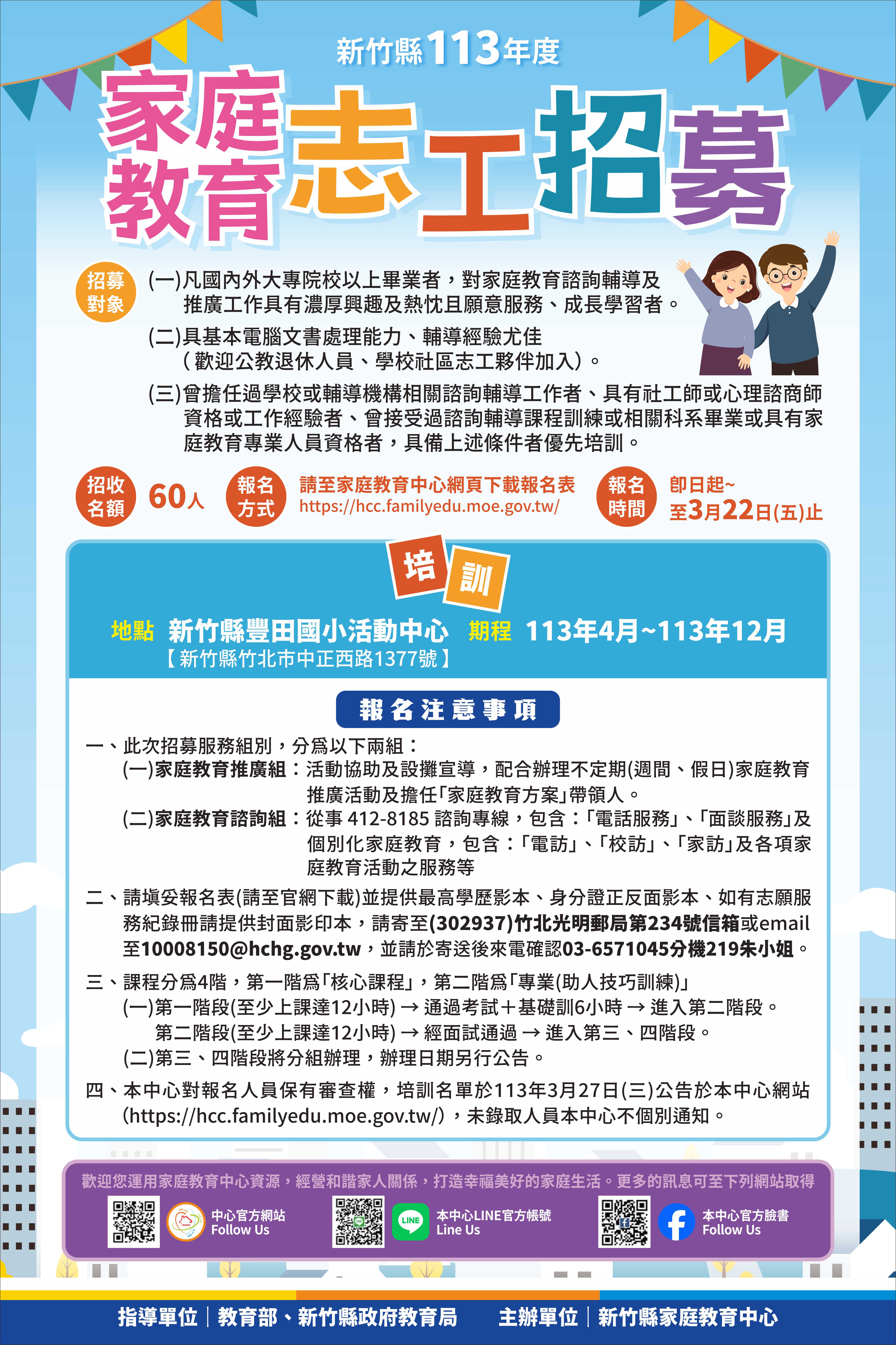 113年度家庭教育志工召募訓練計畫-海報.jpg 113年度家庭教育志工召募訓練計畫-海報2.jpg 113年度家庭教育志工召募訓練計畫-簡章.pdf |
