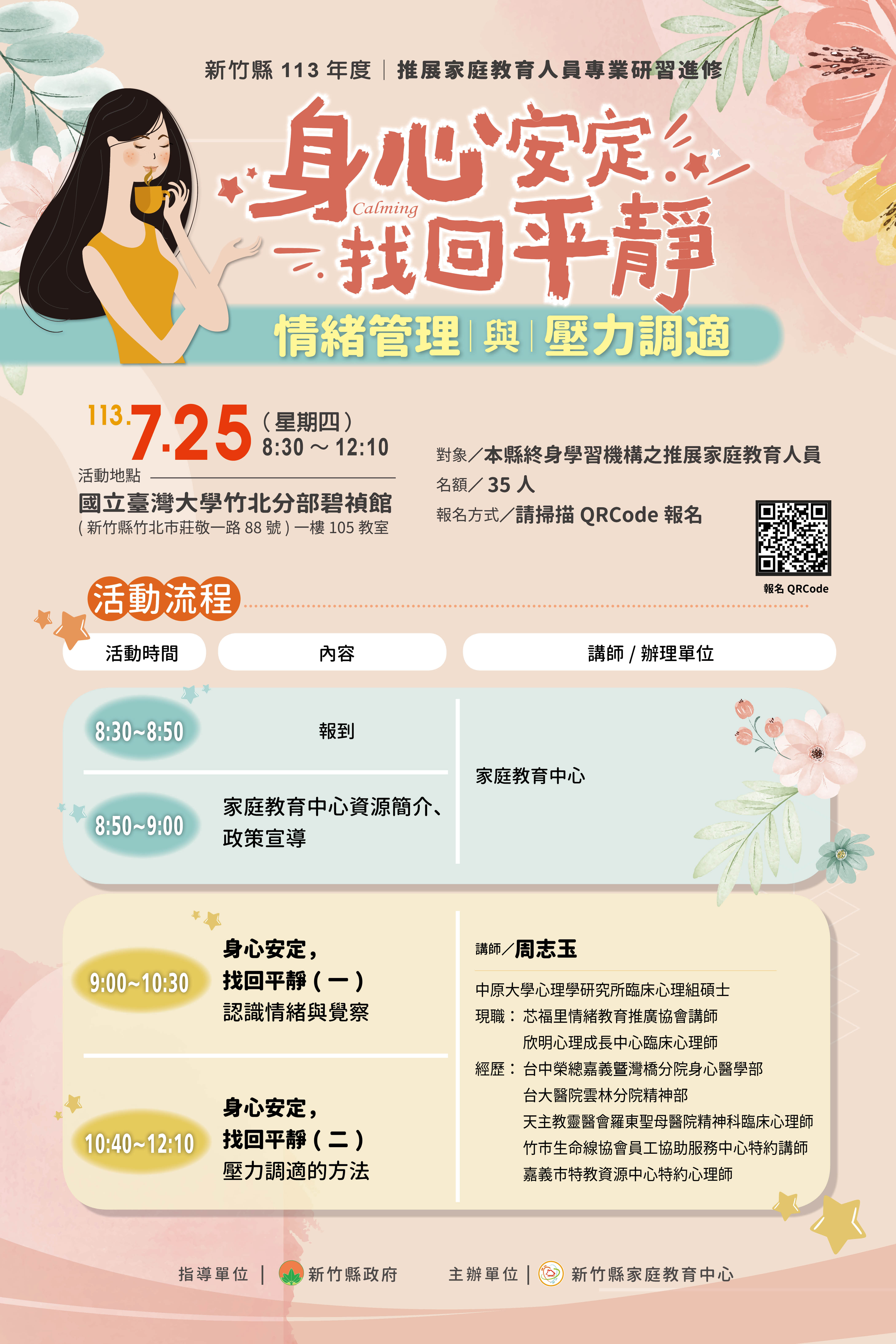 一、依據本縣家庭教育中心113年7月3日竹家教字第1132100268號函、教育部113年1月10日臺教社(二)字第1132400053D號函及家庭教育法第9條及第11條辦理。 二、依家庭教育法第9條規定,終身學習機構推展家庭教育工作人員,每年應接受四小時以上家庭教育專業研習時數;又推廣家庭教育之各類型大眾傳播機構,以及與家庭教育有關之公私立機構,每年定期接受家庭教育專業研習;復依同法第11條規定,主管機關應對前揭人員,提供各種進修課程或訓練。 三、為強化本縣辦理家庭教育業務人員、志工及推動家庭教育相關人員之專業知能,以提供民眾充足及時之家庭教育支持及服務,特規劃本案。 四、旨揭課程相關內容如下: (一)主題:「身心安定,找回平靜:情緒管理與壓力調適」。 (二)研習時間:113年7月25日(星期四)8時30分至12時10分。 (三)研習地點:國立臺灣大學竹北分部碧禎館(新竹縣竹北市莊敬一路88號)一樓105教室。 (四)講師:周志玉(欣明心理成長中心 臨床心理師)。 (五)報名方式:請至以下網址報名(https://www.beclass.com/rid=284d8f0667915b105b1f);(短網址:https://reurl.cc/xaMzdL)。 (六)報名時間:即日起至113年7月19日(星期五)12:00止或額滿為止。 (七)參加對象:辦理家庭教育推展暨相關服務之機關、學校志工、法人及團體之人員與志願工作人員。 (八)參加人數:每單位1-2名為原則,以學校以外終身學習機構人員優先錄取,並依報名先後順序錄取,至35人額滿為止。 五、檢附本活動實施計畫及海報各1份(如附件)。 六、本案聯絡人:新竹縣家庭教育中心莊小姐,電話(03)6571045分機214。 |